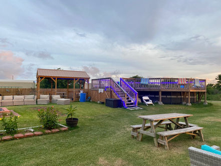 Floating in the pool and watching the sunset at your rental is a heavenly experience, and the neon blue lights at night make great fun. A great fire pit to sit by and relax at night. We also put a great swing set and wood playset and Trampoline for the kiddos to enjoy - and there are several BBQ pits to use by the cabana or your cabin!