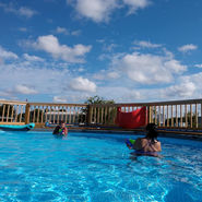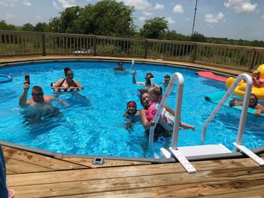 The amazing 27ft above-ground swimming pool here at JJB Cabins. It includes an amazing wrap around deck. Lots of slings, floats included for chillin..
